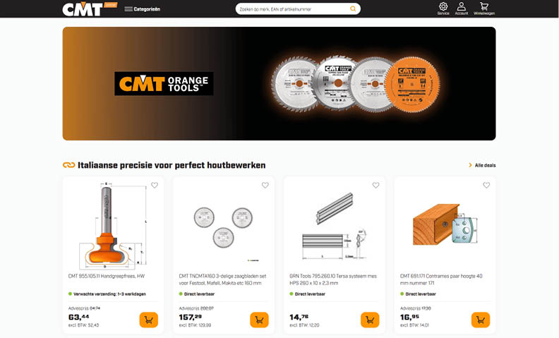 CMT Online is geautoriseerd dealer van CMT Orange Tools, specialist in precisie houtbewerkingsgereedschap. Ontdek hoogwaardige frezen, cirkelzaagbladen, boren en CNC-accessoires voor professionele houtbewerking en interieurbouw, met focus op scherpte en duurzaamheid.