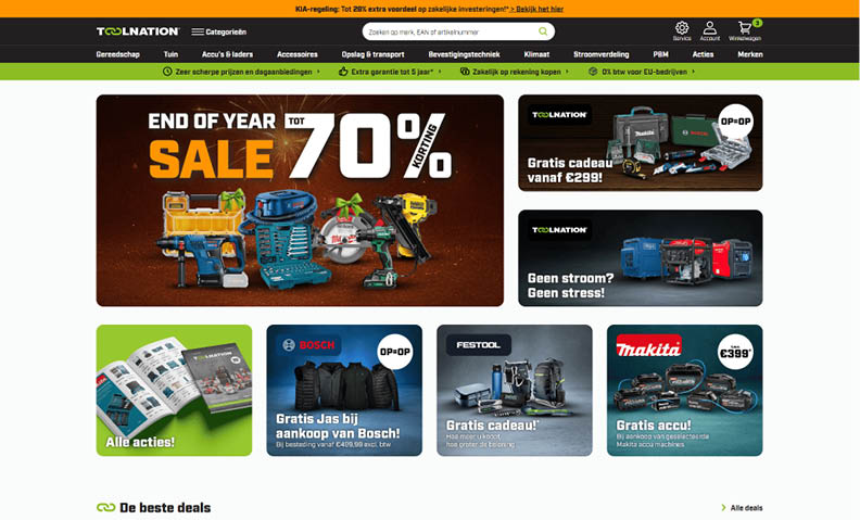 Toolnation is de Nederlandse nummer 1 online winkel voor professioneel gereedschap. Ontdek een uitgebreid assortiment topmerken zoals Makita, Bosch, Milwaukee en DeWalt tegen scherpe prijzen. Geschikt voor vakprofessionals en ervaren doe-het-zelvers, met snelle levering en deskundig advies.